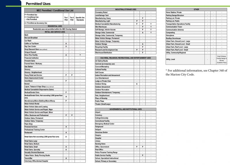 The Marion Enterprise Center (MEC) identifies two unique Tiers to assist in the classification of uses related primarily by their form and function opposed to the pure use of the property.